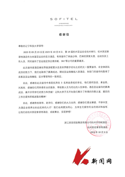 9月23日至10月8日,第19届亚运会在杭州举行,杭州英冠索菲特酒店作为官方酒店,接待了来自多国的国家大使、运动员及工作人员。九九精品视频一区在线久久久久久久久久毛片精品美女|国产99久久久久久免费看|中文精品99久久国产|国产69精品久久久久9999|精品久久久久久中文字幕无码|亚洲熟妇无码久久精品国产精品99|精品国产天堂综合一区在线应用技术学院旅游管理专业2020级学生何劲龙、姜金凯、刘禹彤3名在该酒店实习的学生有幸参加了全程接待工作。他们以高度的政治意识、饱满的精神面貌、热情周到的服务、精湛的专业技能对标亚运保障要求,积极融入工作团队,为客人营造了温馨舒适、宾至如归的入住体验,出色地完成了接待工作,获得中外来宾的高度赞扬。酒店领导向学校发来感谢信,盛赞辽科大学生在亚运会服务期间的出色表现,彰显了东道主热情的待客之道、踏实的工作态度和积极进取的精神。
