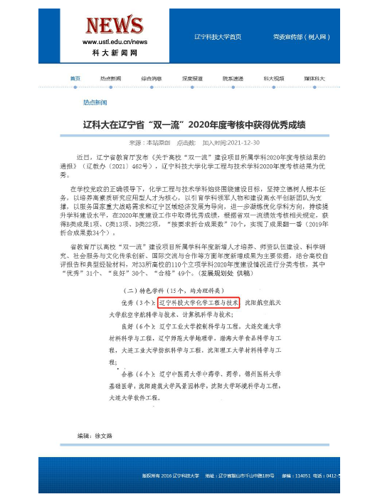 化学工程与技术在辽宁省双一流评估中获评优秀